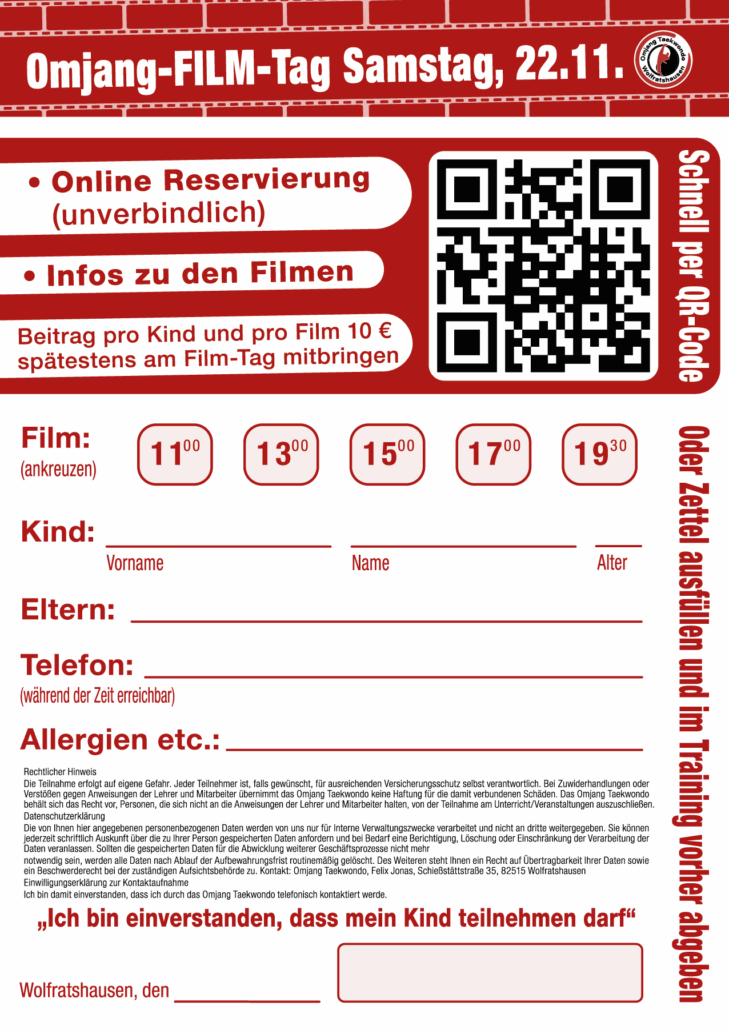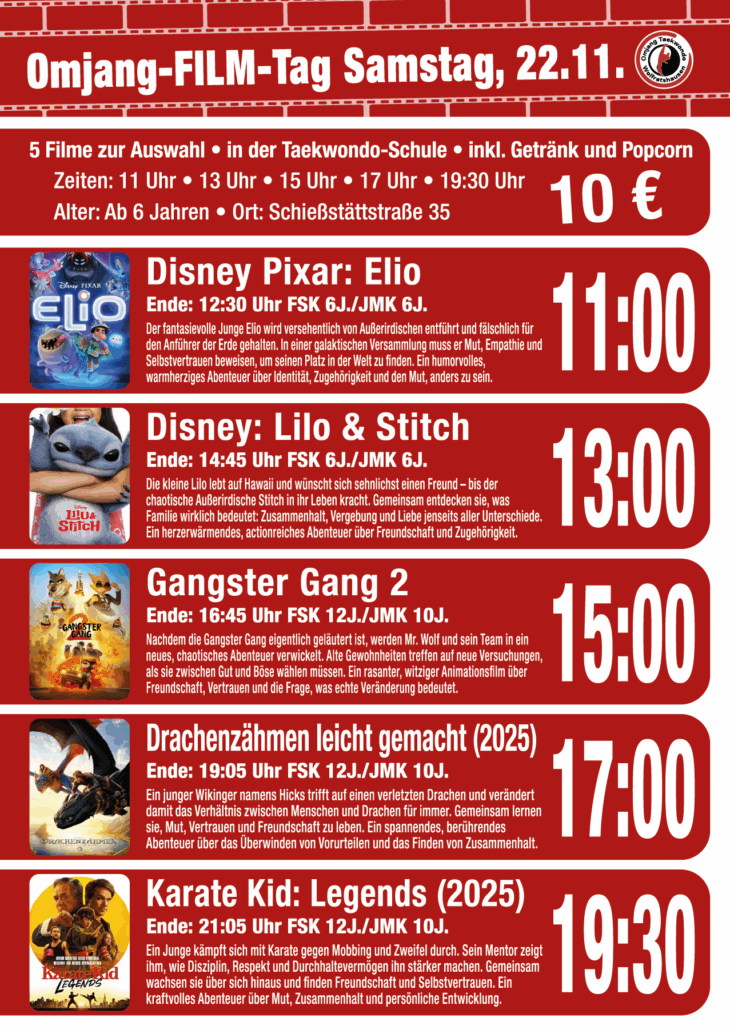 Wir bieten den Kindern am Samstag, den 22.11.2025 wieder die Möglichkeit, in die Taekwondo-Schule zu kommen und zusammen Filme anzuschauen!