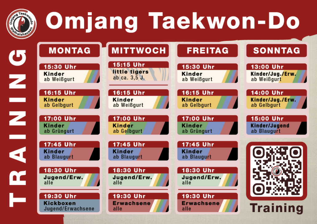 Am Sonntag findet immer um 13 Uhr eine zusätzliche Stunde statt: ab Weißgurt (10. Kup) für Kinder/Jugend/Erwachsene. Die nachfolgende Stunde um 14 Uhr ist dann ab Gelbgurt und ab 15 Uhr dann nur noch ab Blaugurt aufwärts. Die Zeiten im Detail: